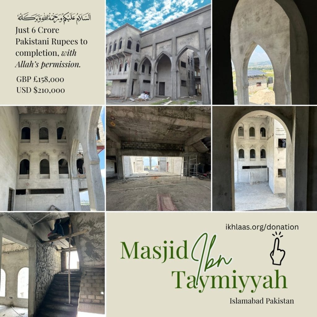 One of our most noble endeavours is the construction and completion of Masjid Ibn Taymiyyah, a mosque that will serve as a centre for daily and congregational prayers, education, Qur’an and ḥadīth classes, community outreach, youth programmes, and regular lessons (duroos). This project is not merely bricks and mortar for this world, but Sadaqah Jāriyah: i.e., a means of ongoing reward for all who participate.